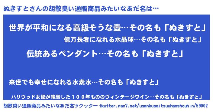 | ヒーロー風カッコイイあだ名 | 『幻影騎士ヌキ』『ウルトラぬきすとマン』 |