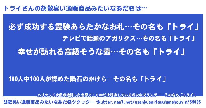 | 男性向けラノベタイトル風あだ名 | 『緋弾のトライ』『魔弾の王とトライ』 |