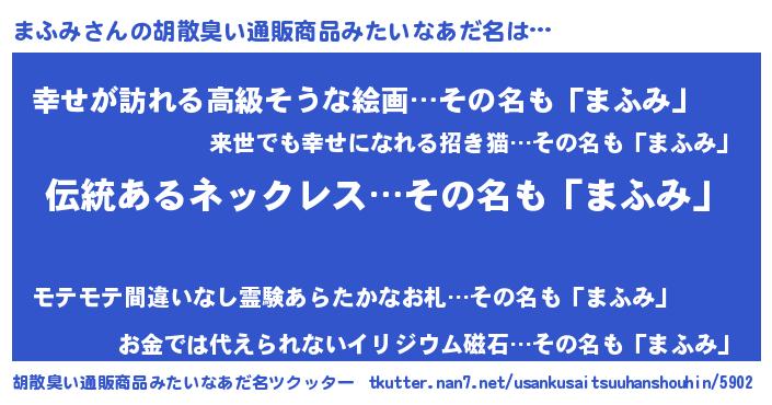 | 男性向けラノベタイトル風あだ名 | 『まふみの嫁は女の子じゃないと思った?』 |