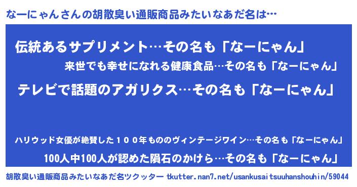 | 男性向けラノベタイトル風あだ名 | 『転生したらなーにゃんだった件』 |