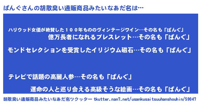 | 男性向けラノベタイトル風あだ名 | 『ぱんぐに滅ぼされるだけの簡単なお仕事です』 |