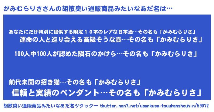 | 男性向けラノベタイトル風あだ名 | 『おまえをオタクにしてやるから、俺をかみむらりさにしてくれ! 』 |