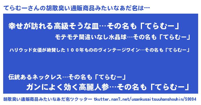 | 男性向けラノベタイトル風あだ名 | 『魔弾の王とてらむー』『緋弾のテラムー』 |