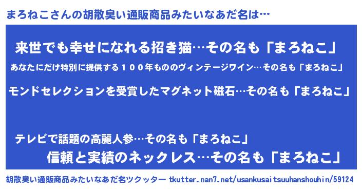 | 男性向けラノベタイトル風あだ名 | 『まろねこに滅ぼされるだけの簡単なお仕事です』 |