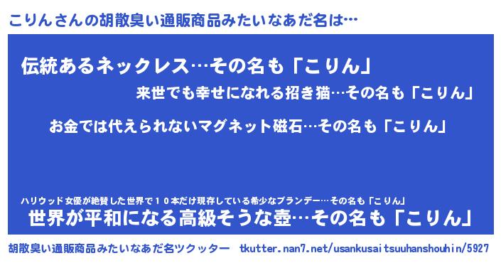 | 男性向けラノベタイトル風あだ名 | 『こりんに滅ぼされるだけの簡単なお仕事です』 |