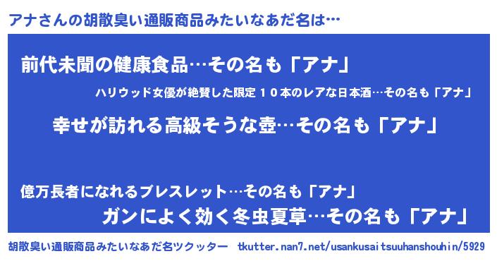 | 男性向けラノベタイトル風あだ名 | 『アナスレイヤー』『はたらくアナさま!』 |