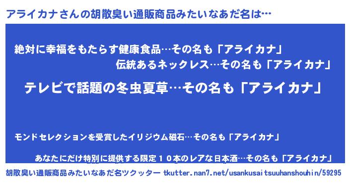 | 意味不明あだ名 | 『自称アライカナ』『永久保存アライカナ』 |