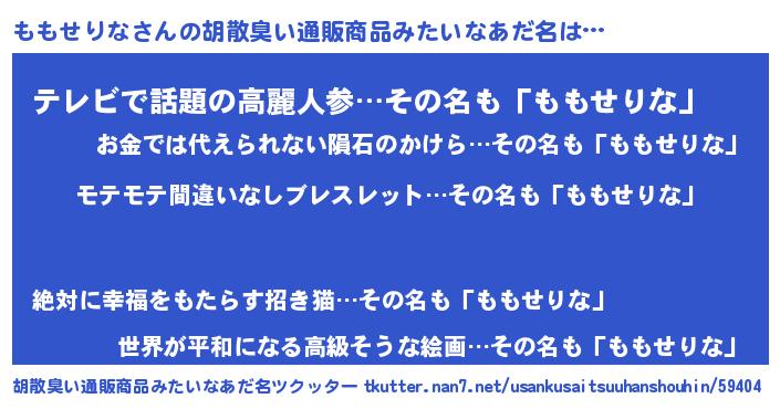 | 男性向けラノベタイトル風あだ名 | 『モモセリナアートオンライン』 |