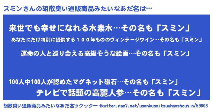 | 意味不明あだ名 | 『スミンフォーエバー』『永久保存スミン』 |