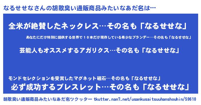 | 男性向けラノベタイトル風あだ名 | 『Re:なるせせなから始める異世界生活』 |