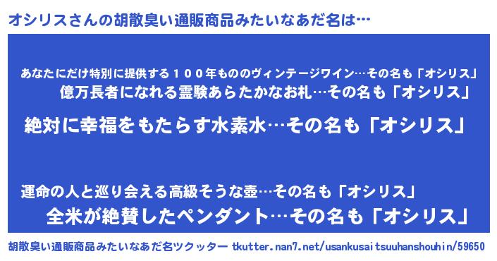 | 男性向けラノベタイトル風あだ名 | 『オシリスという概念が存在しない退屈な世界 』 |