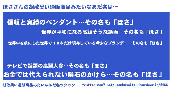| 男性向けラノベタイトル風あだ名 | 『この素晴らしい世界にほさを!』 |