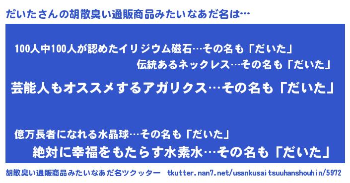 | 女子向けラノベタイトル風あだ名 | 『闇のだいた』『死神だいたの再婚』 |