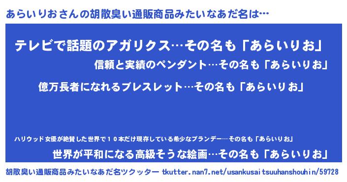 | 意味不明あだ名 | 『ペロリンあらいりお』『自称あらいりお』 |