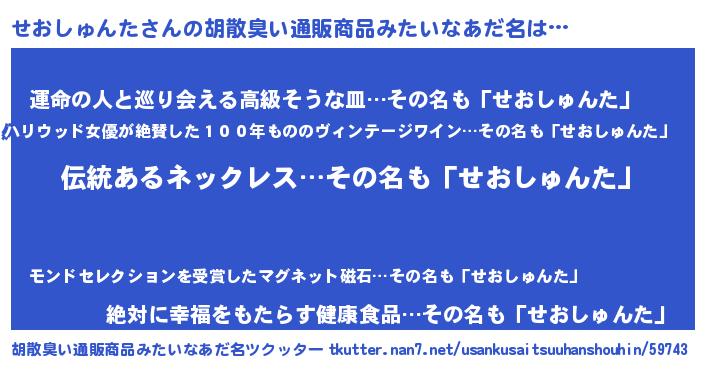 | 意味不明あだ名 | 『とにかく怪しいせおしゅんた』 |