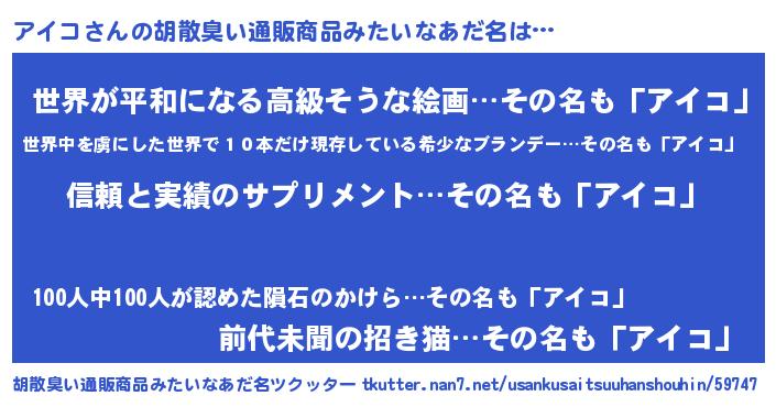 | ヘコむあだ名 | 『アイお』『豆乳』『アイコ(笑)』 |