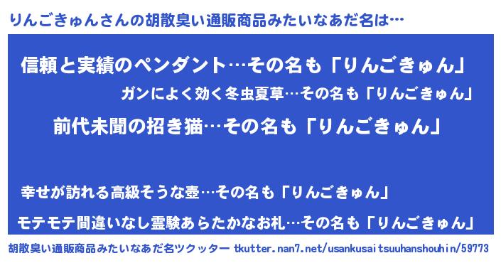 | 男性向けラノベタイトル風あだ名 | 『りんごきゅん~年齢イコール彼女いない歴の魔法使い~』 |