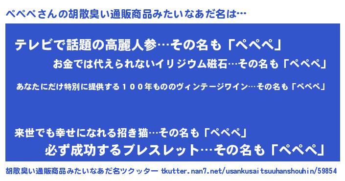 | 男性向けラノベタイトル風あだ名 | 『ぺぺぺ~年齢イコール彼女いない歴の魔法使い~』 |