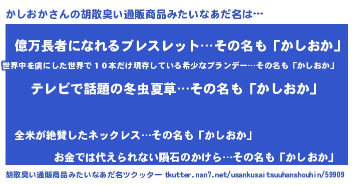 | 男性向けラノベタイトル風あだ名 | 『Re:かしおかから始める異世界生活』 |