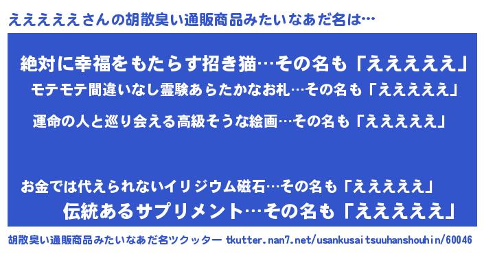 | 男性向けラノベタイトル風あだ名 | 『えええええに滅ぼされるだけの簡単なお仕事です』 |