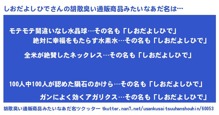 | 意味不明あだ名 | 『とにかく怪しいしおだよしひで』 |