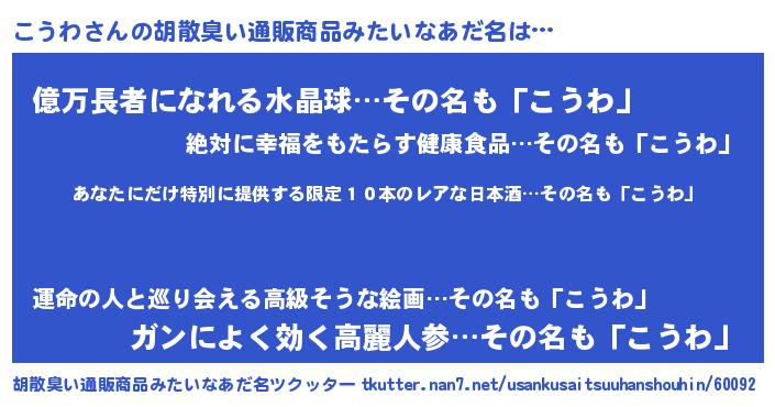 | 意味不明あだ名 | 『住所不定無職こうわ(53歳)』『自称こうわ』 |