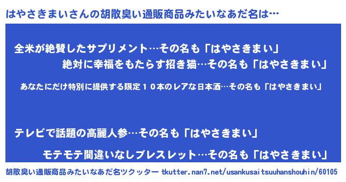 | 男性向けラノベタイトル風あだ名 | 『はやさきまいに滅ぼされるだけの簡単なお仕事です』 |