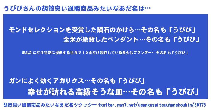 | 意味不明あだ名 | 『住所不定無職うびび(84歳)』 |