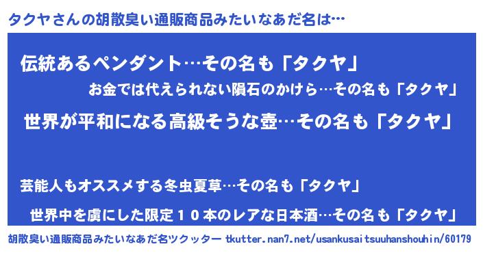 | ヘコむあだ名 | 『豆乳』『タクっぺ』『タクっふぃ~』 |