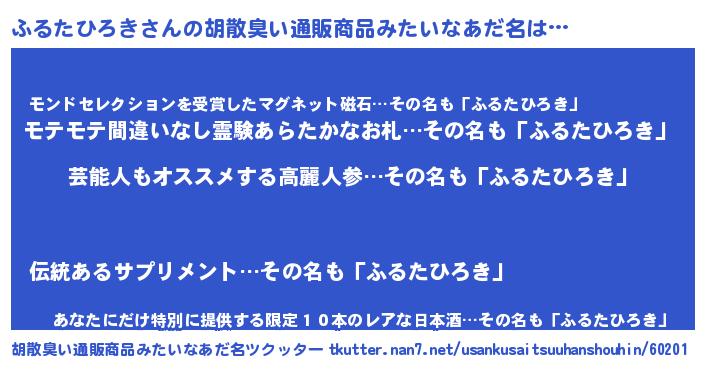 | 男性向けラノベタイトル風あだ名 | 『ふるたひろきに滅ぼされるだけの簡単なお仕事です』 |