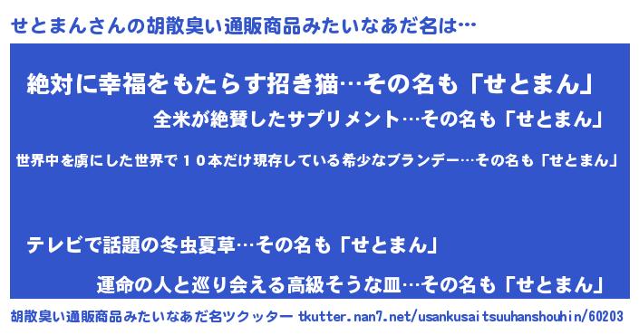 | 意味不明あだ名 | 『住所不定無職せとまん(89歳)』 |