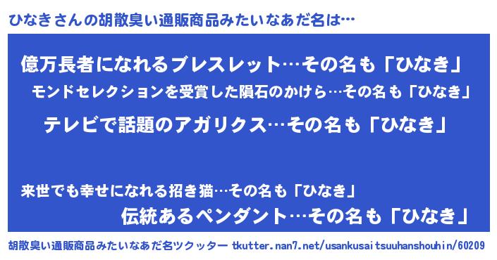 | ヘコむあだ名 | 『ひなふぇ~』『ひな太郎』『つくし』 |
