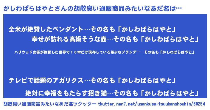 | 意味不明あだ名 | 『住所不定無職かしわばらはやと(93歳)』 |