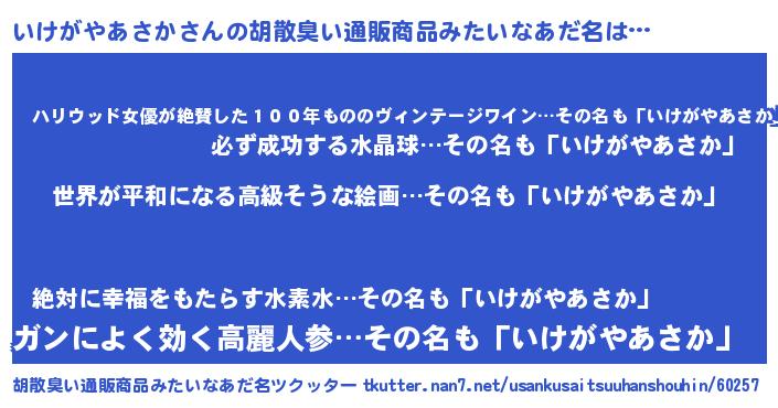 | 肩書あだ名 | 『いけがやあさか総理大臣』 |