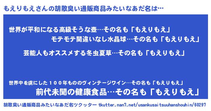 | 男性向けラノベタイトル風あだ名 | 『Re:もえりもえから始める異世界生活』 |