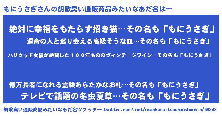 | 意味不明あだ名 | 『住所不定無職もにうさぎ(9歳)』 |