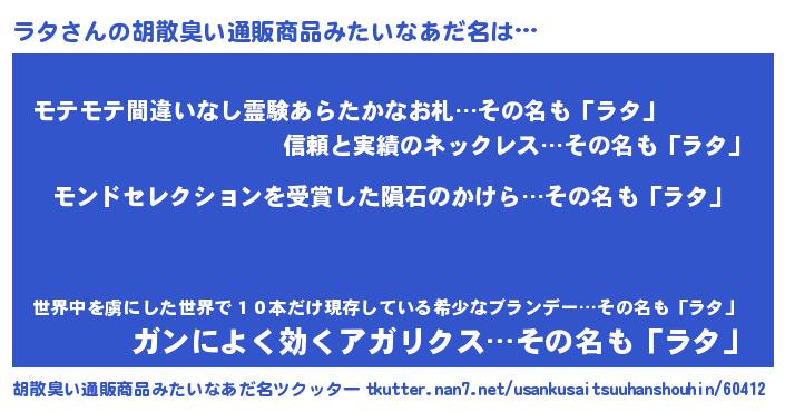 | 女子向けラノベタイトル風あだ名 | 『死神ラタの再婚』『ラタ姫と円卓の騎士』 |