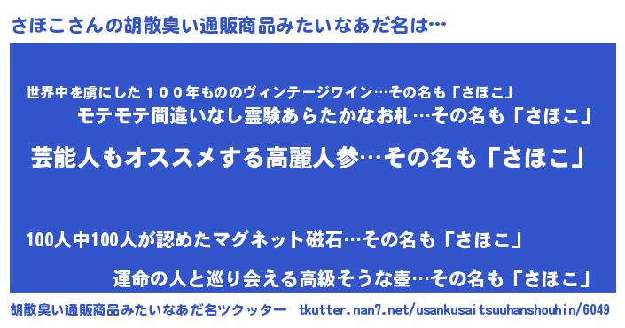 | 意味不明あだ名 | 『自称さほこ』『住所不定無職さほこ(3歳)』 |