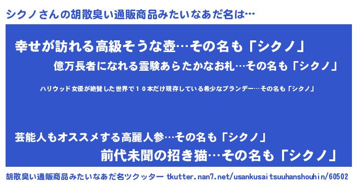 | ヒーロー風カッコイイあだ名 | 『仮面シクダー』『ウルトラシクノマン』 |