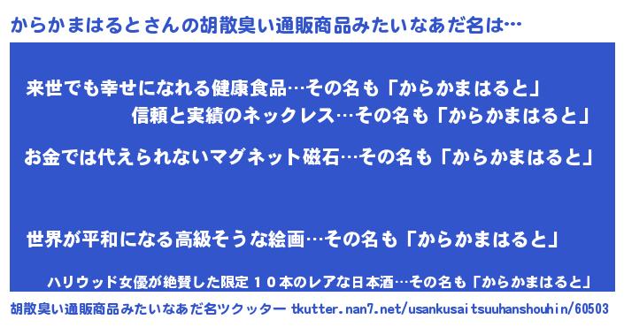 | 男性向けラノベタイトル風あだ名 | 『ノーゲーム・ノーカラカマハルト』 |