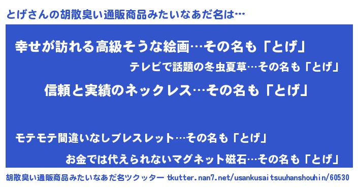 | 女子向けラノベタイトル風あだ名 | 『とげは平凡を望む』『とげの雑貨屋さん』 |