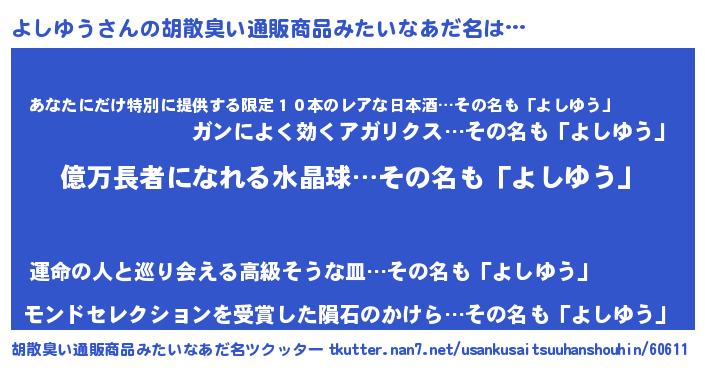 | 意味不明あだ名 | 『ペロリンよしゆう』『自称よしゆう』 |
