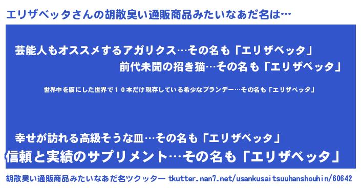 | 意味不明あだ名 | 『住所不定無職エリザベッタ(74歳)』 |