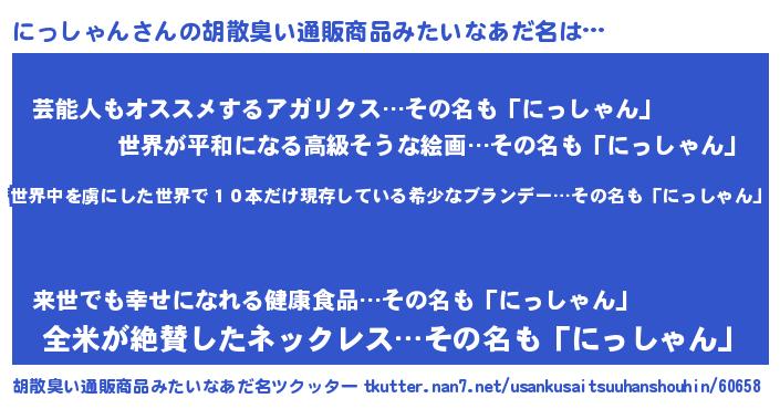 | 意味不明あだ名 | 『住所不定無職にっしゃん(85歳)』 |