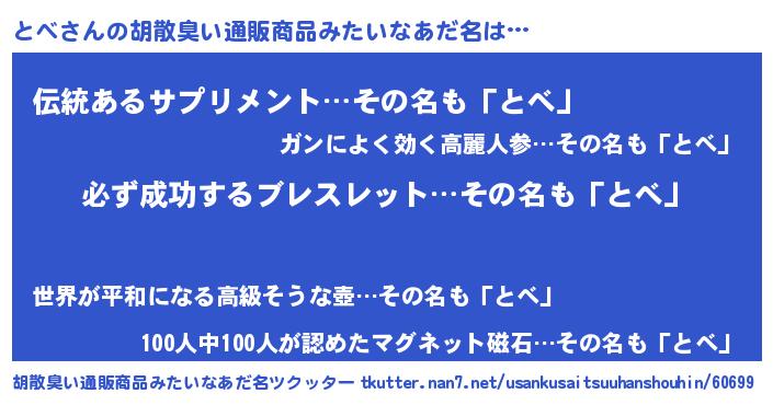 | 意味不明あだ名 | 『ペロリンとべ』『とにかく怪しいとべ』 |