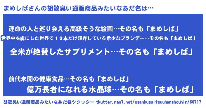 | 男性向けラノベタイトル風あだ名 | 『まめしばの嫁は女の子じゃないと思った?』 |