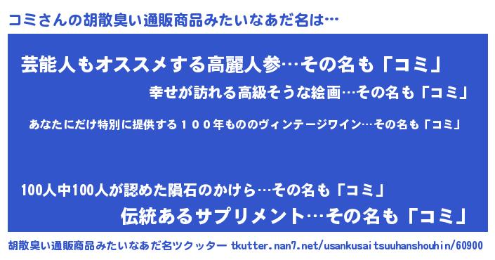 | ヘコむあだ名 | 『コミ太郎』『酢こんぶ』『コミにー』 |