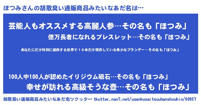 | 意味不明あだ名 | 『住所不定無職ほつみ(85歳)』『自称ほつみ』 |