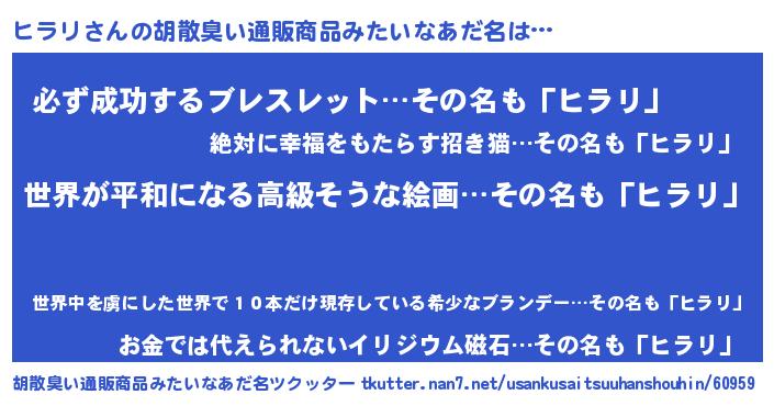 | 意味不明あだ名 | 『ヒラリフォーエバー』『ペロリンヒラリ』 |