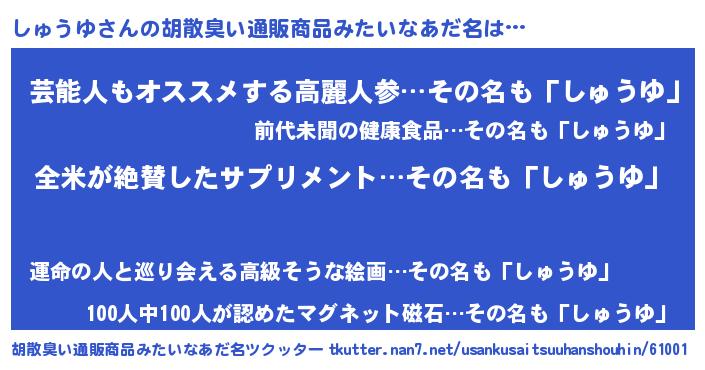 | ヘコむあだ名 | 『しゅお』『しゅうゆ(小並感)』 |